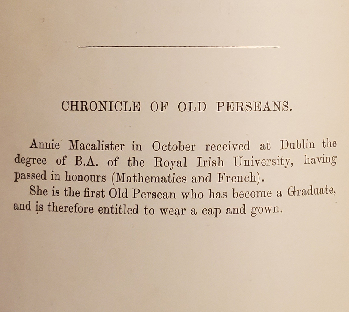 The Persean Magazine of November 1898 reports that Annie Macalister is the first Perse Girl to receive a university degree and be entitled to “wear a cap and gown”. Annie’s degree was from the Royal Irish University and she graduated with honours in French and Mathematics, leading the way for thousands of Guild members who followed her path to university from Perse Girls and Stephen Perse schools.